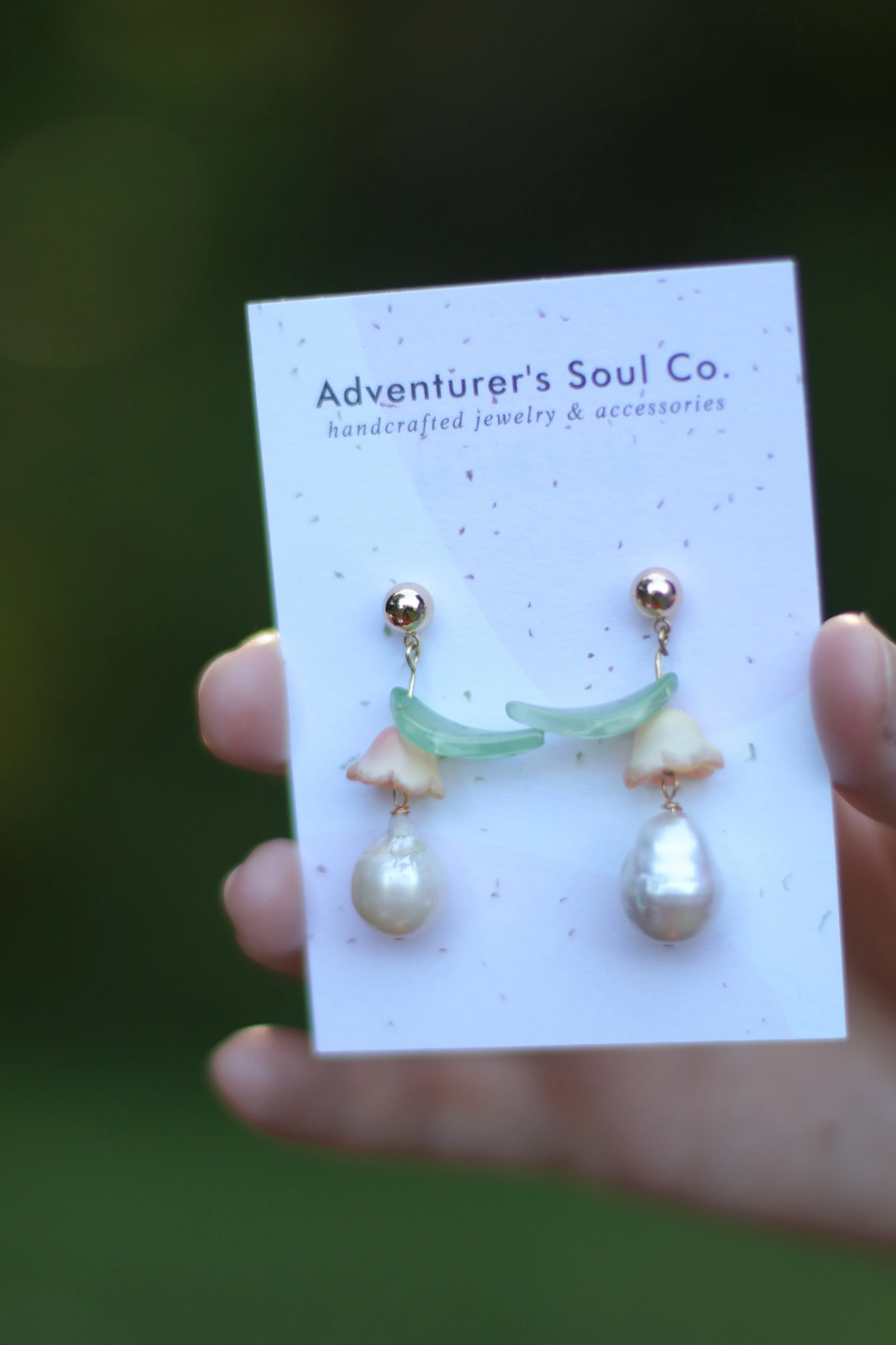 All of our earrings are on 14-karat gold-filled ball posts or hoops, or stainless steel posts attached with U.V. resin. This ensures that our earrings are of the highest quality without being “fine” jewelry. All pearl elements are real, but to ensure a bit more affordability than saltwater pearls, we use the freshwater variety.